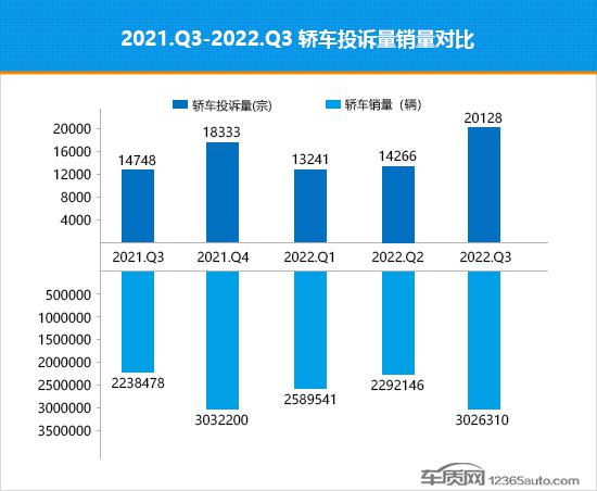 从近一年来各季度轿车投诉量销量变化来看,三季度轿车(除进口车)投诉量延续此前的涨势,并首次突破2万宗,创造了季度投诉量的历史最高纪录。环比上涨41.1%,同比上涨36.5%。同期,三季度的轿车销量也迎来了反弹,达到了近一年来的最高点,环比上涨32%,较2021年三季度上涨35.2%。