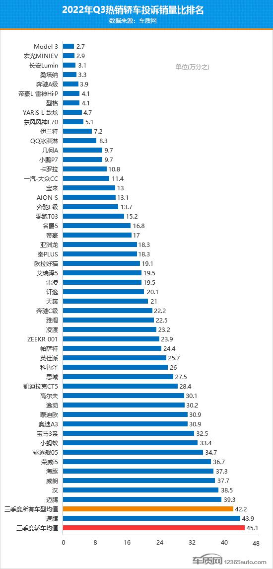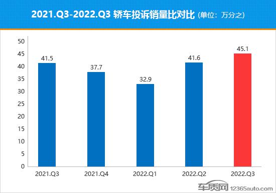据国内领先的缺陷汽车产品信息收集平台车质网数据显示,2022年三季度共受理国内轿车投诉量累计为20,128宗,乘联会数据显示同期国内轿车(除进口车)销量约为302.6万辆。除进口车型外,三季度有销量数据支撑的轿车共有196款,为确保数据的准确性,车质网本次只统计这196款车型的首次投诉案例,计算得出2022年三季度轿车投诉销量比均值为万分之45.1,数值较二季度的万分之41.6有明显提高,整体投诉销量比表现持续转差。