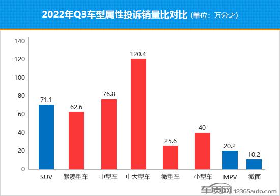 从各车型三季度投诉销量比数值来看,中大型车、中型车和紧凑型车的投诉销量比数值明显高于轿车季度投诉销量比均值万分之45.1。特别是中大型车,投诉销量比数值持续攀升,由二季度的万分之70.4飙升至万分之120.4,数值远高于其他各车型。此外,本季度中型车的投诉销量比数值也较二季度有大幅提升,拉低了三季度轿车整体投诉销量比表现。