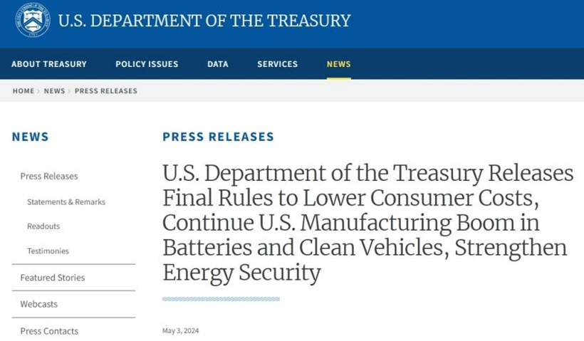 5月6日消息,当地时间周五,拜登政府最终还是放宽了对电动汽车税收抵免的限制,允许美国消费者在2026年底之前为含有中国石墨和其他关键矿物的汽车获得最高7500美元的税收抵免。当地时间周五,美国财政部公布税收抵免最终规则时做出了这一调整。税收抵免旨在鼓励电动汽车生产,推动矿产和电池供应链进入美国。