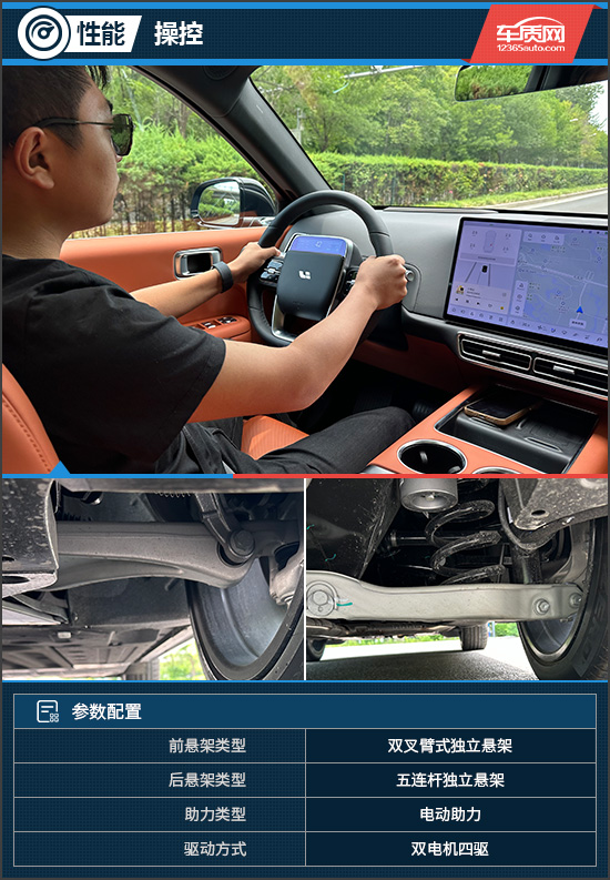 与其他理想L系列车型不同的是,理想L6全系没有配备空气悬架,这可能会让一些消费者担心理想L6的悬架是否舒适。而通过实际体验后我可以负责的告诉大家,大可放心,凭借CDC连续可变阻尼减振器,理想L6对于路面细碎振动过滤的不错,保障了舒适性,并且由于整体尺寸变小,灵活性也得到提升,没有驾驶L9那种忽忽悠悠的大车感。NVH方面,得益于双层隔音玻璃以及静音轮胎,理想L6无论是风噪还是胎噪,都抑制的十分出色,能够带来舒适的隔音体验,在同级中占有一定的优势。