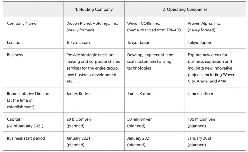 按照计划,新公司将于明年1月开始运营,控股公司的运营资本预计为200亿日元,Woven CORE的运营资本预计为5000万日元,Woven Alpha的运营资本预计为1亿日元。目前担任TRI-AD首席执行官的James Kuffner将领导这三家公司,三家公司的总部都将设在TRI-AD目前位于东京市中心的办公地点。
