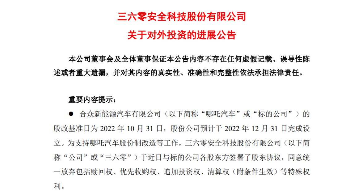 12月28日晚间,三六零(601360,SH)发布对外投资进展公告,宣布其近期已与哪吒汽车各股东方签署了股东协议,以支持哪吒汽车股份制改造等工作。