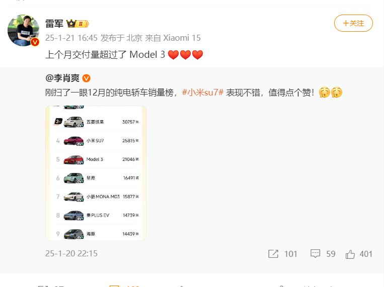 1月22日消息,小米集团董事长兼CEO雷军于近日转发小米汽车副总裁李肖爽的微博,并称小米SU7上个月(2024年12月)交付量过特斯拉Model 3。