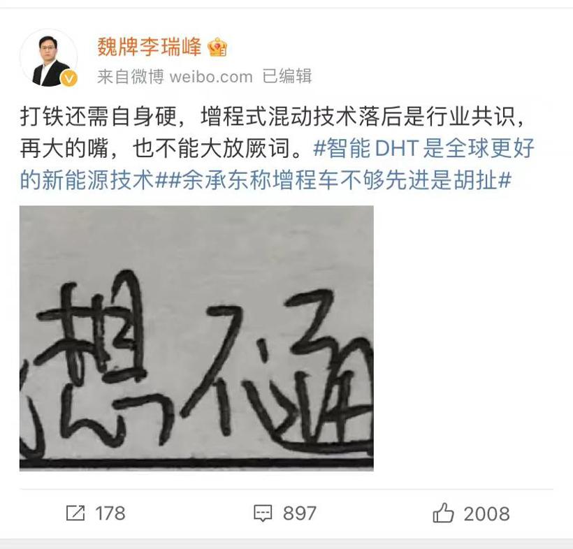 江湖上,余承东素有余大嘴的绰号,初涉新能源汽车领域,余承东对自家产品和路线的安利也在意料之中,但出人意料的是,魏牌反手开撕。